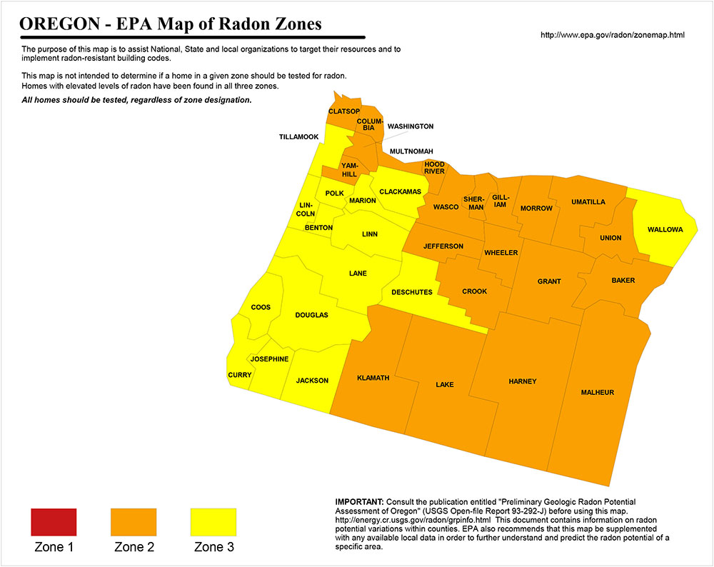 Per data compiled by the Oregon Public Health Division, 28 zip codes, 12 of which are in Portland, have a high risk of radon poisoning. Northwest Oregon, including the Columbia Gorge and Willamette River Valley, tends to be the area of greatest known concern for radon exposure in the state.